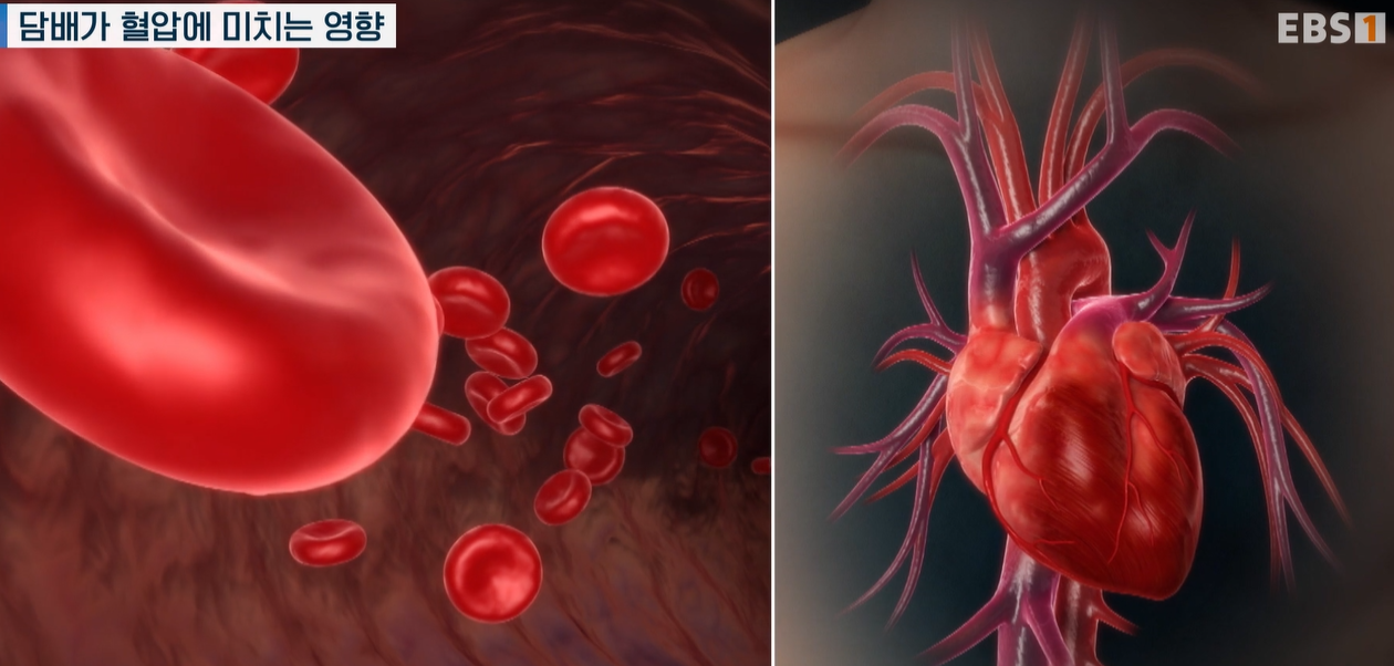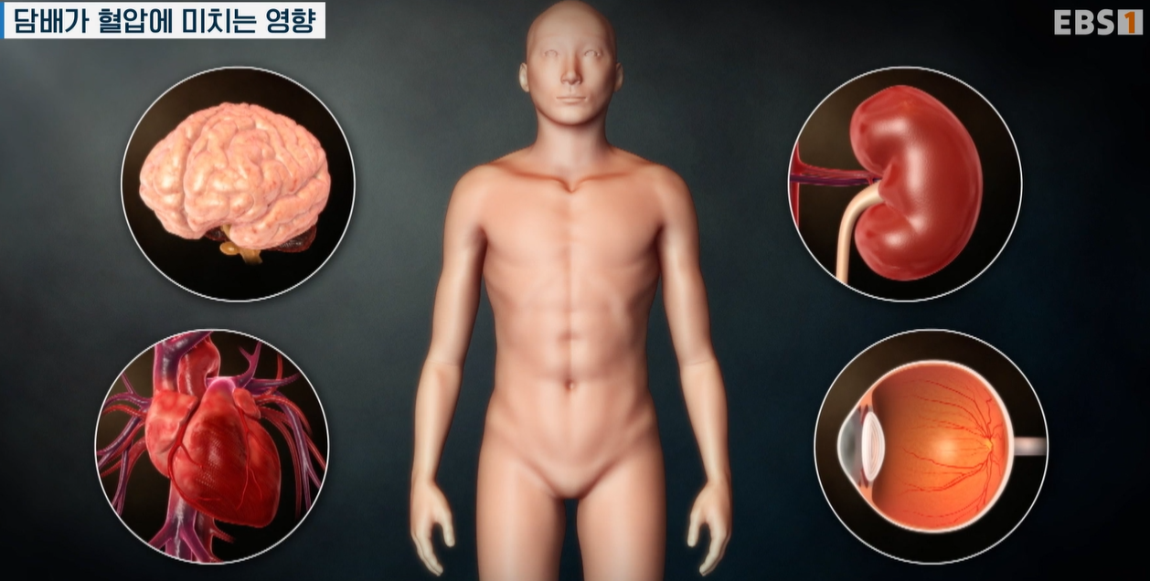 담배를 피우면 니코틴이 교감신경계를 자극해 혈관을 수축시키고 혈압을 올립니다. 이때 니코틴은 혈액의 산소 운반 능력을 저하시켜, 심장을 더 빨리 뛰게 만듧니다. 또한 혈관 내피세포를 손상시켜서 동맥경화를 촉진하고, 고혈압 합병증을 유발합니다.