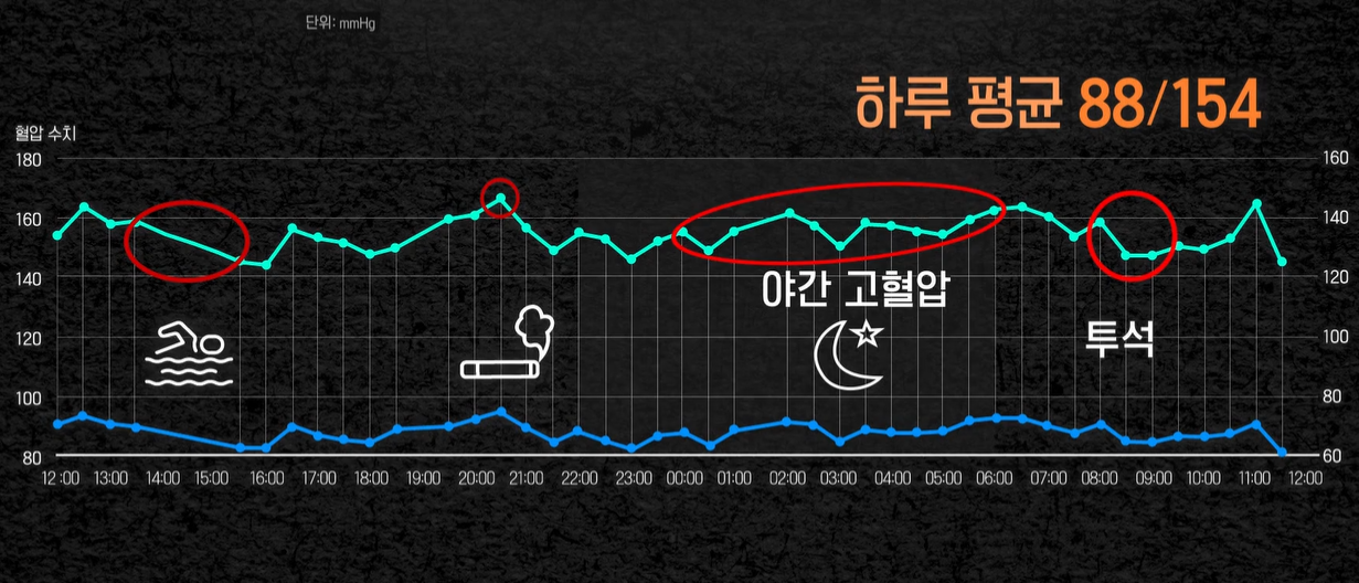 환자 E의 24시간 활동 혈압을 측정한 결과입니다. 아래 그래프에서 보시면, 수영을 하면서 혈압이 가장 안정적으로 떨어졌고, 이후에 흡연을 하면서 혈압이 최고조로 올라갔으며, 이후에 야간 고혈압을 유지하다가 다시 아침에 투석을 하면서 혈압이 안정적으로 낮아지는 것을 확인하실 수 있습니다. 따라서 담배가 혈압에는 치명적임을 알 수 있습니다. 빨리 끊으시길 바랍니다.