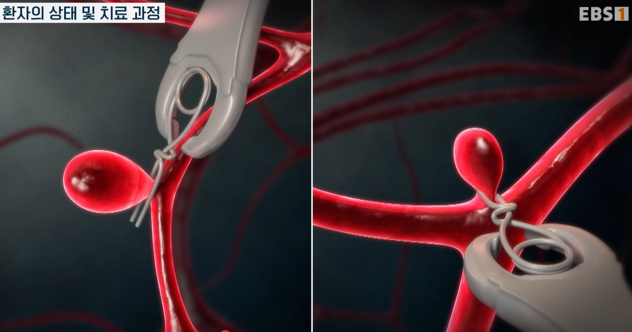 먼저 왼쪽 기저핵에 일어난 뇌경색은 약물로, 혈전을 치료해 해결했습니다. 2개의 뇌동맥은 외과적 시술인 클립결찰술을 시행했습니다.