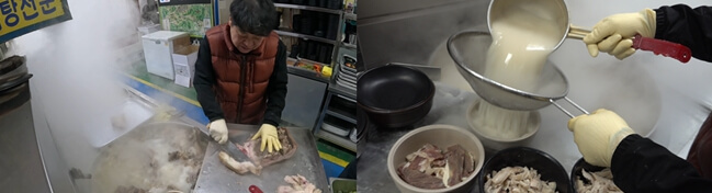 기름기를 걷어내고 잡내를 제거하는 작업은 손이 많이 갈 뿐만 아니라 시간도 오래 걸려 쉬운 일이 아니었다. 하지만 이러한 과정이 있어야만 깊고 담백한 국물이 완성될 수 있었기에 그는 절대 대충하지 않았다. 온종일 끓어오르는 솥 앞에서 땀을 흘리며 국물을 지켜보는 시간도 마찬가지였다. 하루 종일 불 앞에 서 있어야 하는 것은 물론, 손님들에게 내놓을 고기를 적절한 두께로 썰어 준비하는 일도 그의 몫이었다. 뿐만 아니라, 최근에는 택배 주문이 많아지면서, 직접 곰탕을 포장하고 배송을 준비하는 일까지 해야 했다.